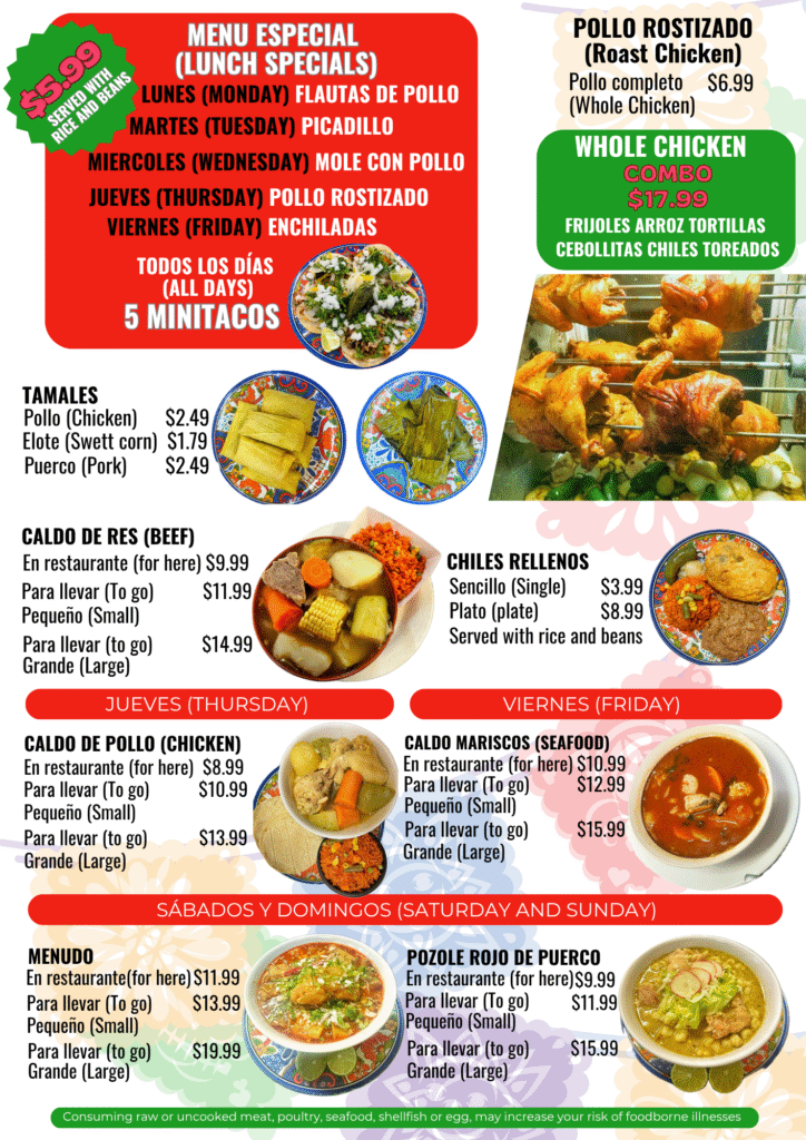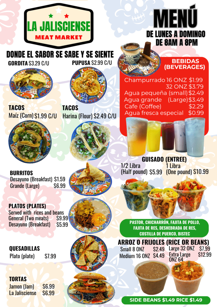 NUESTRA COCINA, NUESTRO CORAZÓN Cocinamos todos los días, con ingredientes frescos, con recetas originales, con sabores de nuestra tierra, cocinamos con el corazón! para deleitar a nuestros clientes. Nuestro MENÚ Especial, para todos los días! LUNCH SPECIALS Menú COMPLETO - La JALISCIENSE